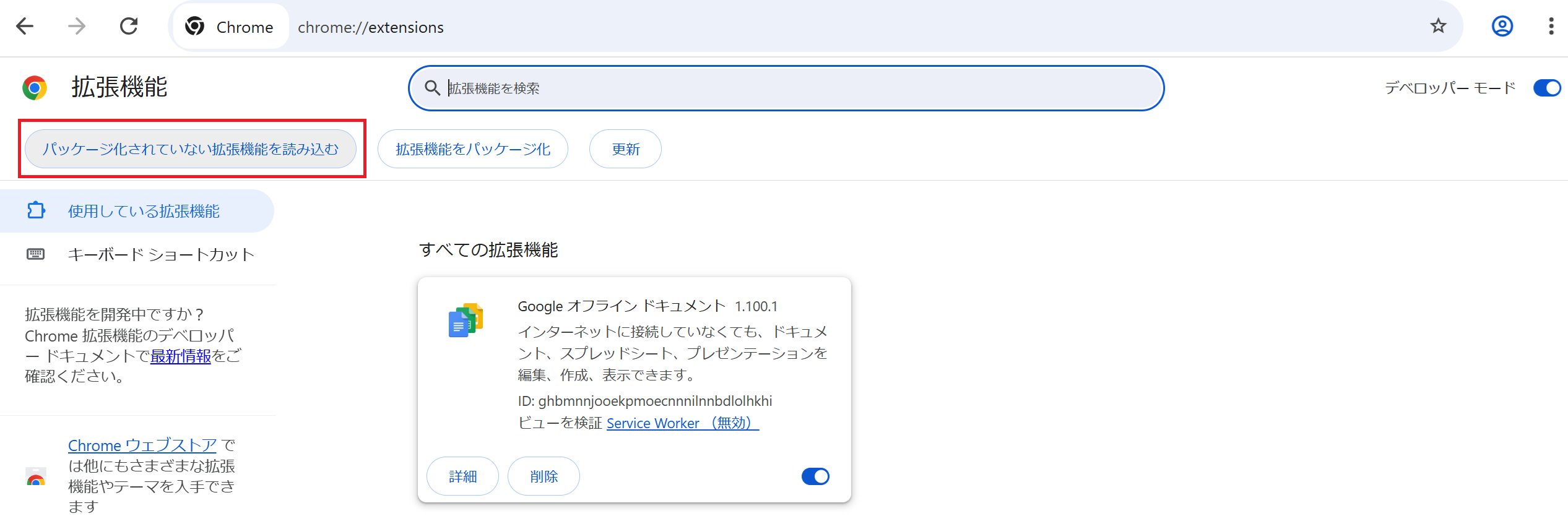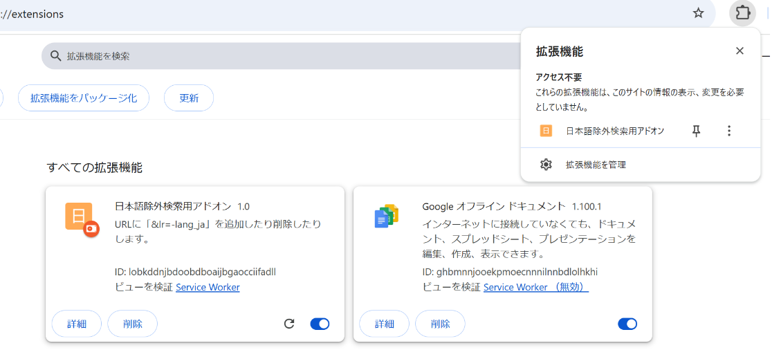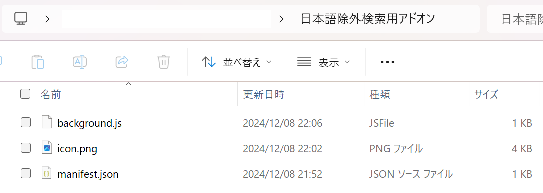 manifest.json、background.js、icon.pngを同じフォルダ(今回は日本語除外検索用アドオンというフォルダ名)に格納し、このフォルダをブラウザのアドオンページからアップロードする。Google Chromeの場合は次でアクセスできる。