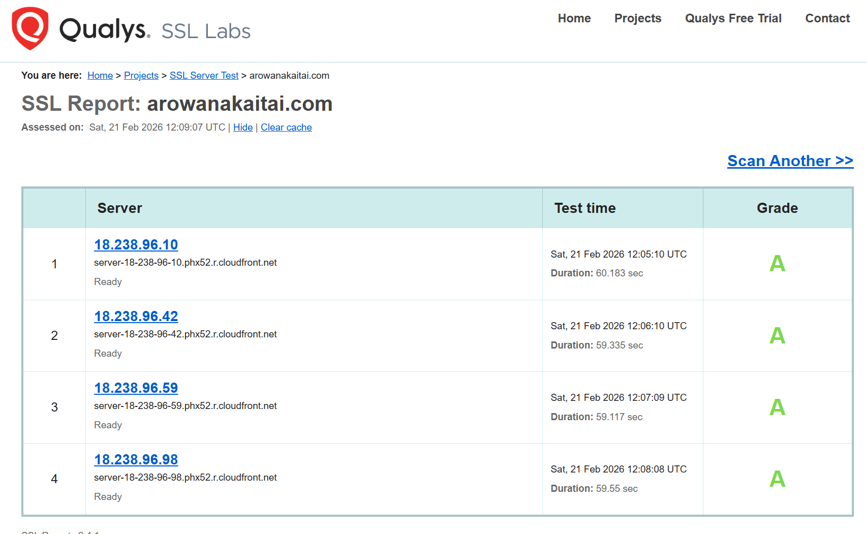 今回得られた結果は、CloudFrontのエッジサーバに対する評価であるが、それによって「https://arowanakaitai.com/」の前には適切なCDNが配置されていることが推測できた。なお、例えばHSTS設定などを反映すれば、最高評価であるA+となるかもしれない。