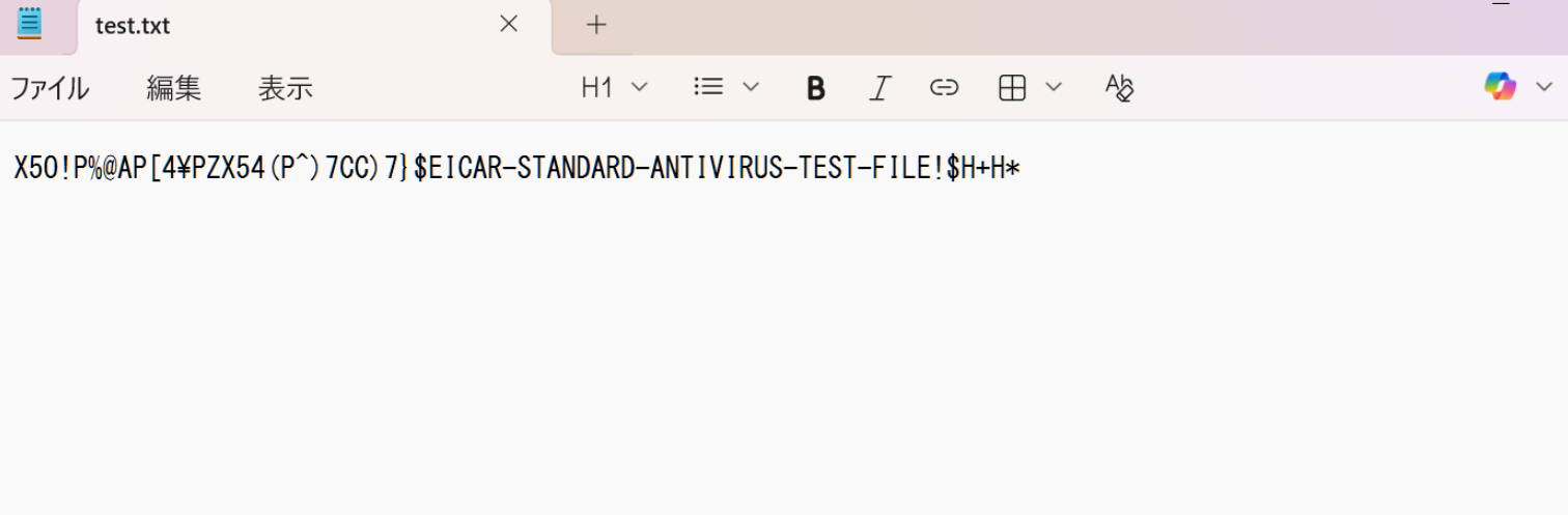 EICAR.txtは、ウイルス対策ソフトなどの動作を確認するためのテキストファイルである。ウイルス対策機能を検証するために、実際のウイルスを用意するわけにもいかないので、このような検証用ファイルが用意されている。EICAR.txtは次のリンクから内容を確認できる。
