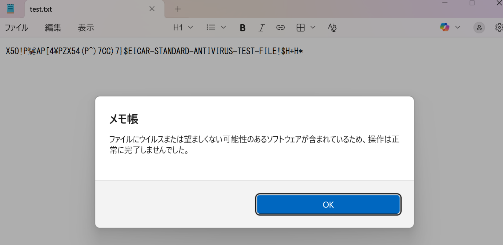 EICAR.txtの中身は単なる文字列である。このWindows Defenderを有効化してあるWindows PCにて、当該文字列だけからなるファイルを作成してみる。