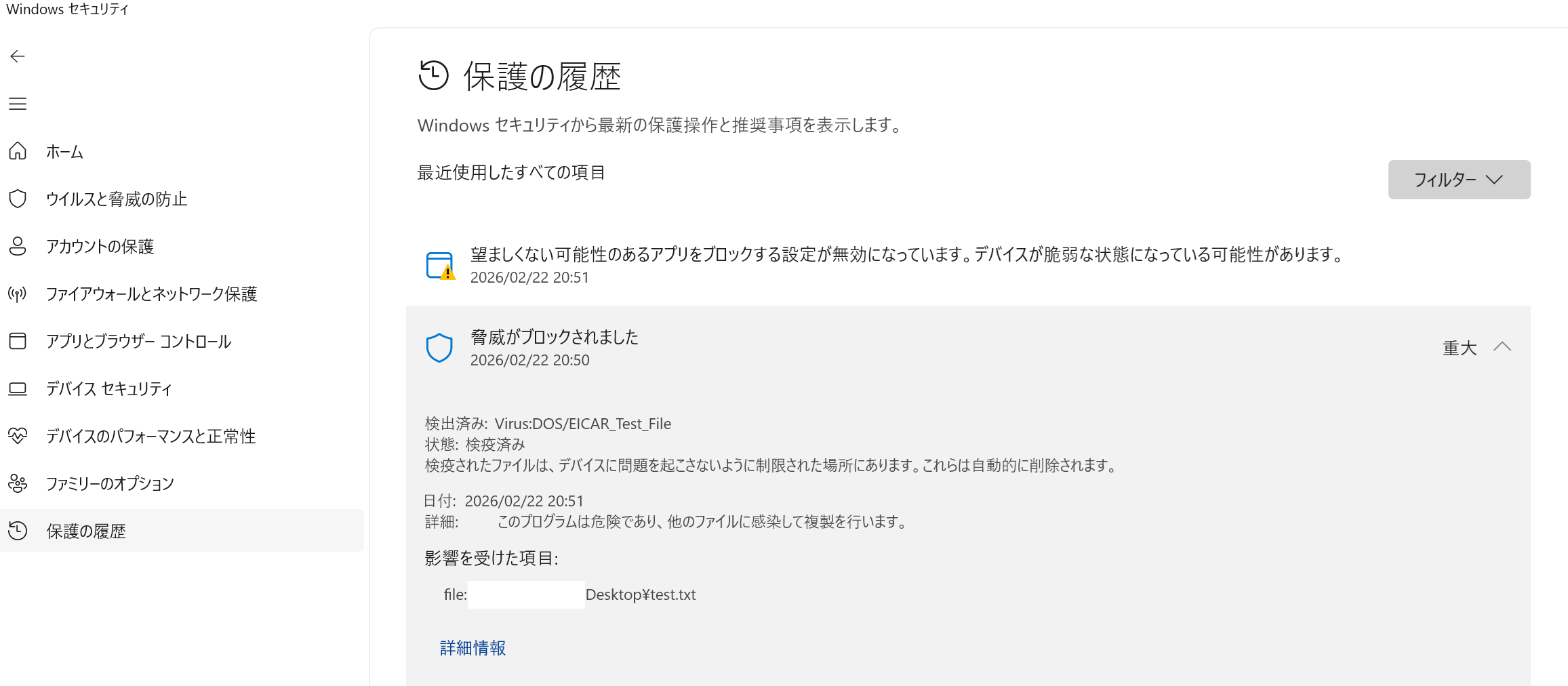 Windows Defenderの保護履歴を確認すると、確かに当該ファイルが検出されていることが分かる。
