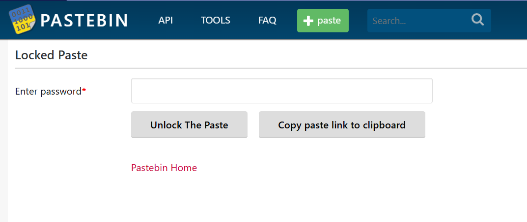 元の問題文にあると思われるメッセージを含むようなPASTEBINのサイトにアクセスすると、パスワード制限のかかったページが表示される。