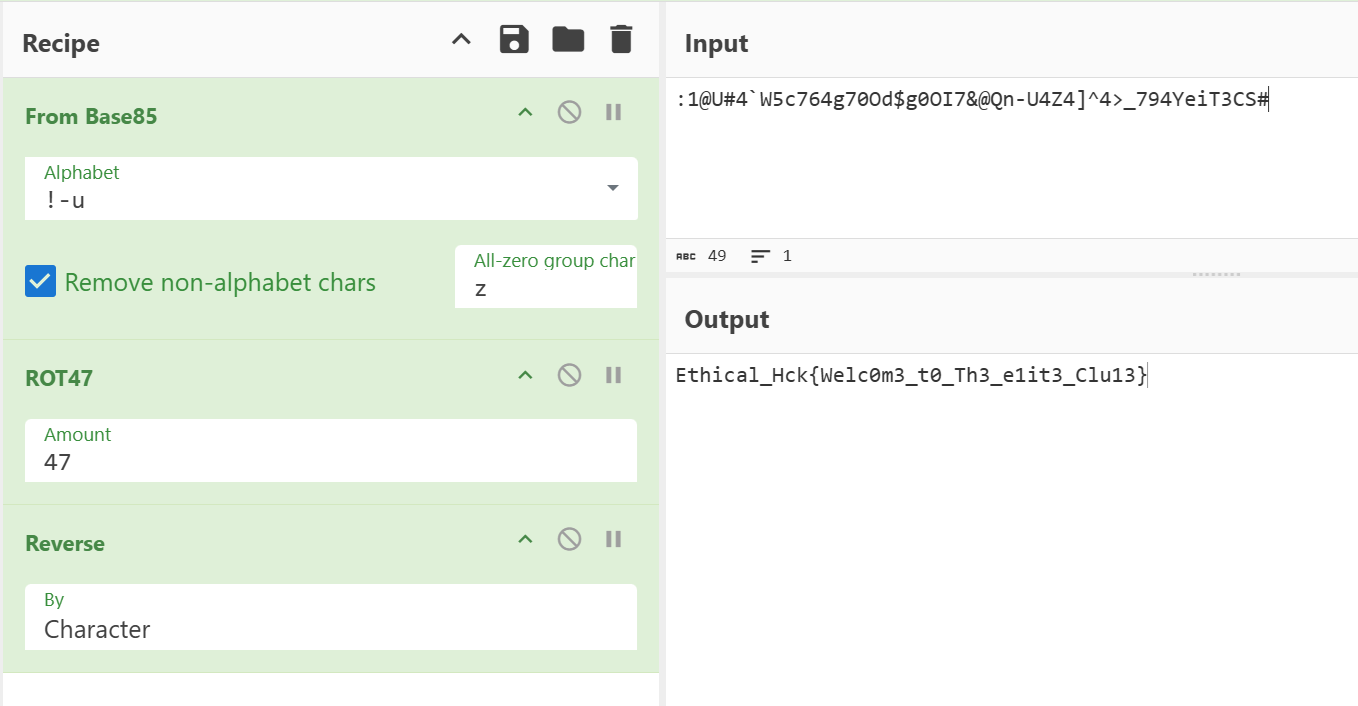 この文字列がどのように暗号化されているかは知識不足により特定できなかったが、参考ブログのヒントを頼りに、CyberChefで次のようなレシピを試すと復号できた。