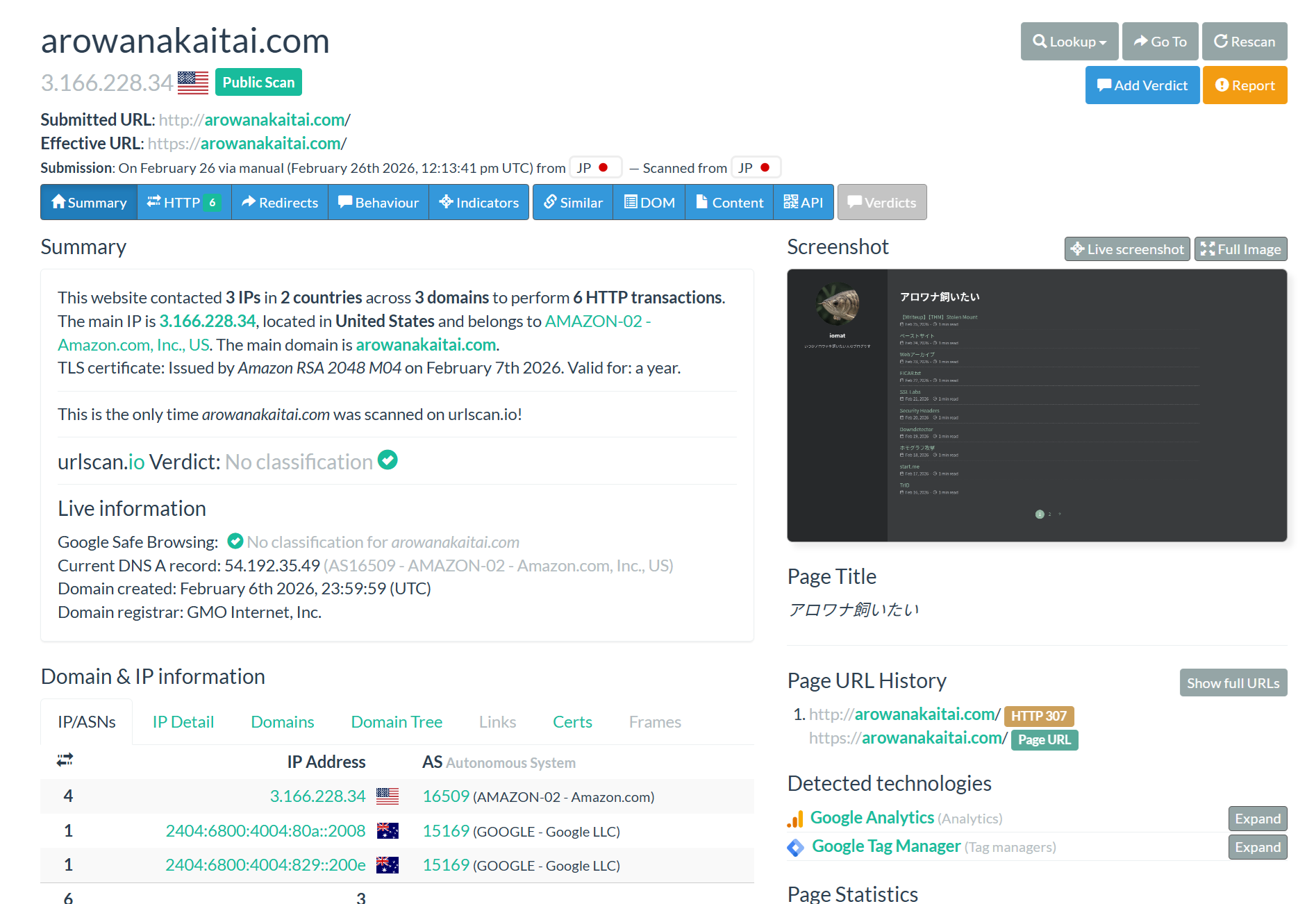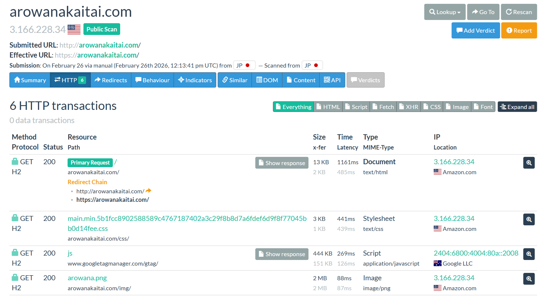 「arowanakaita.com」を対象にスキャンしてみた結果は次のとおりである。