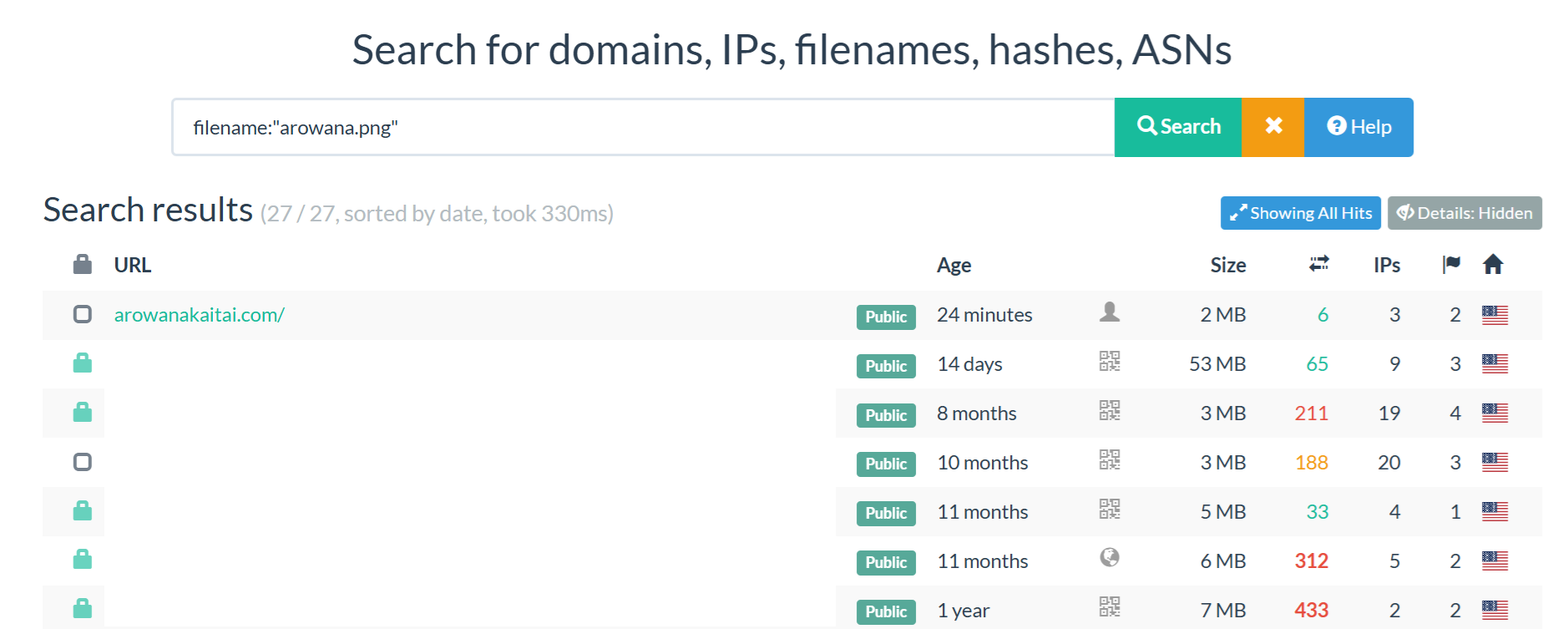 さらに、表示結果の「arowana.png」をクリックすると、arowana.pngの文字列を含むファイルをホストしていると見受けられるWebサイトを表示してくれる。この度の結果は27件であり、世界には27のアロワナ愛好家がいる可能性があることが分かる。
