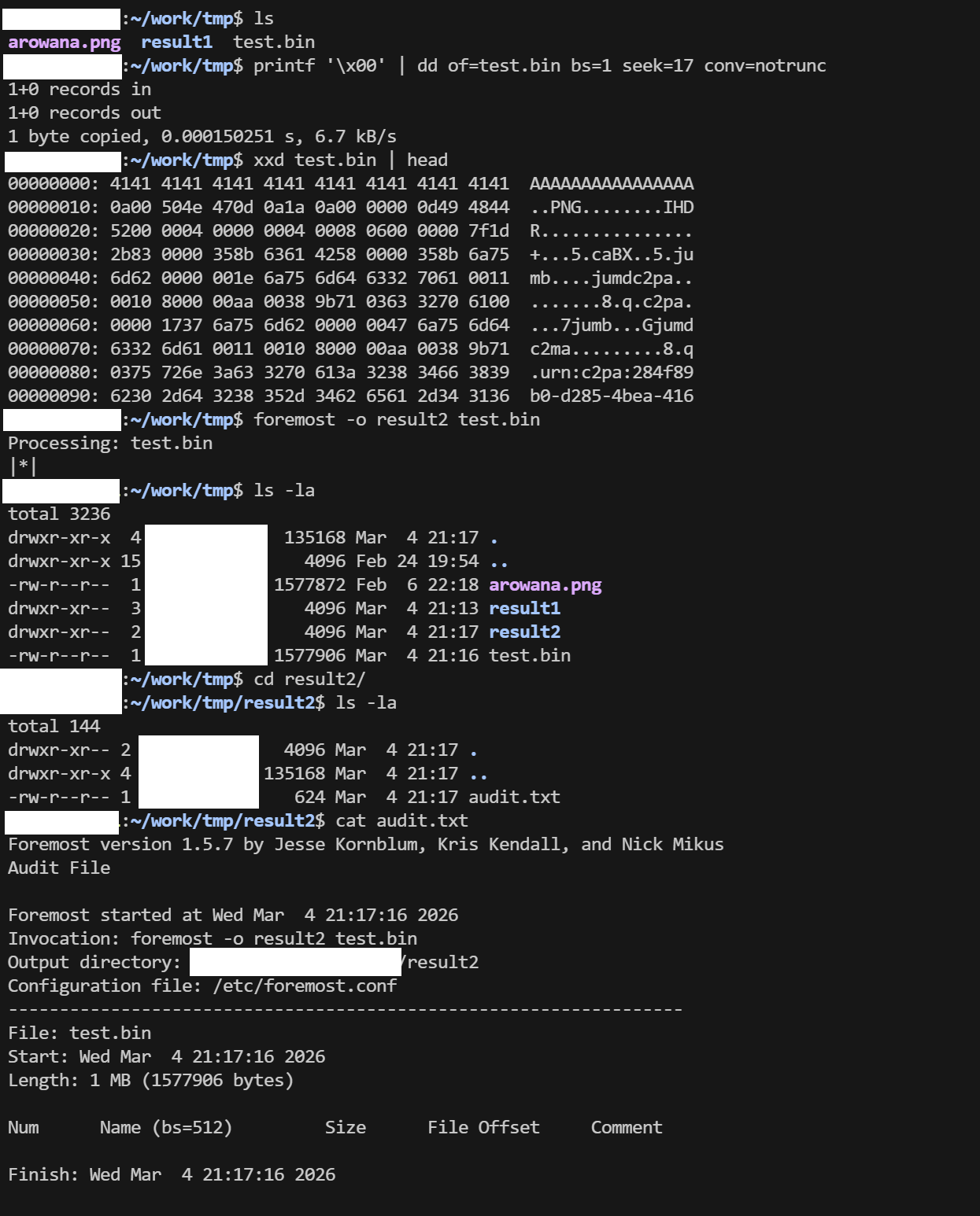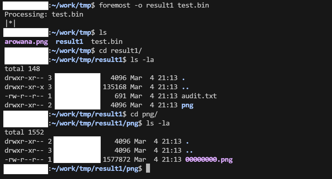 test.binにarowana.pngが埋め込まれたので、foremostで抽出できるか確認してみる。