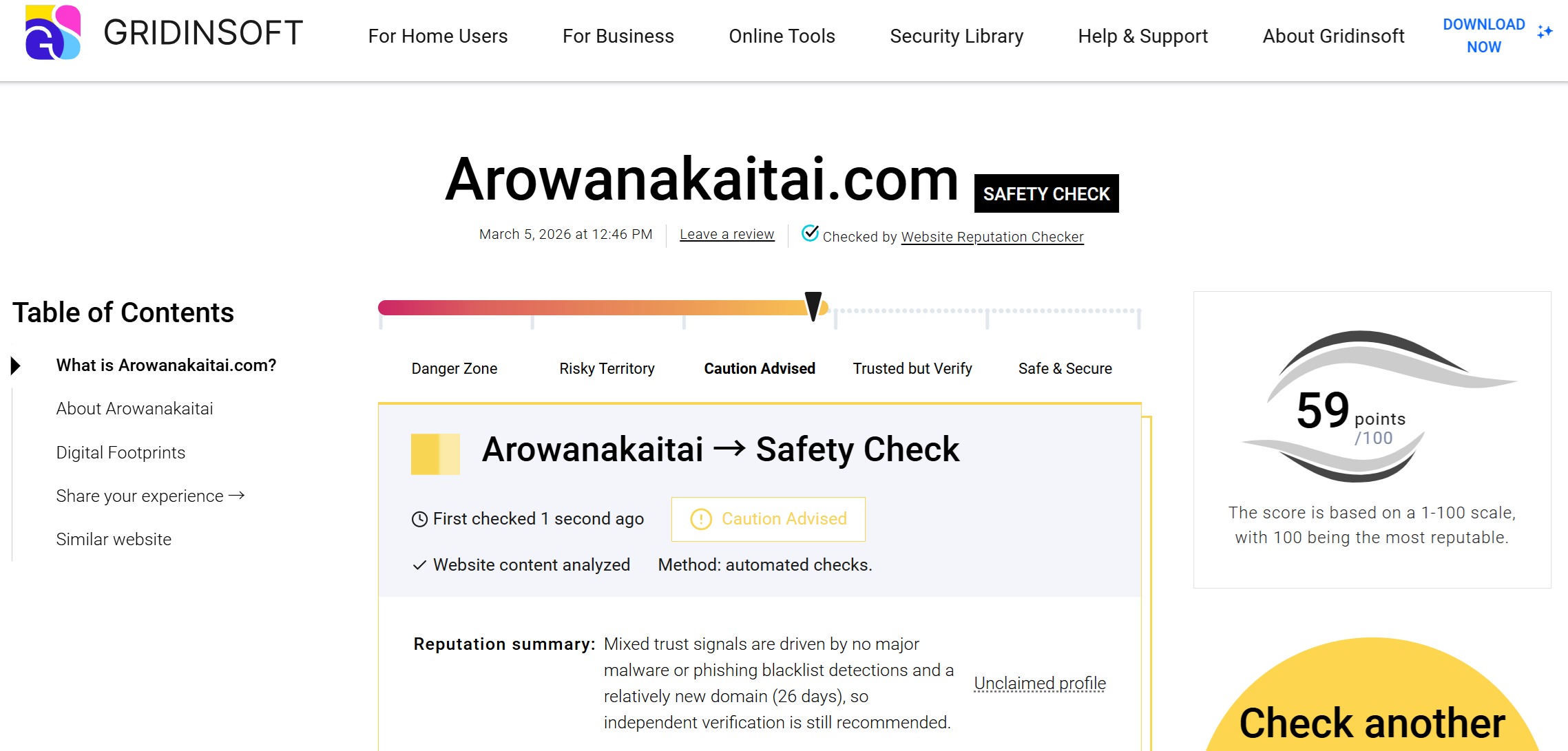 調べたりAIサービスに聞いたりしてもよく分からないWebサイトがある場合は、GRIDINSOFTによるWebサイトのレピュテーションを確認してみるとよい。当該Webサイトにアクセスしてよいかどうかの判断が難しい場合は、こういったサービスを利用してみることも重要である。