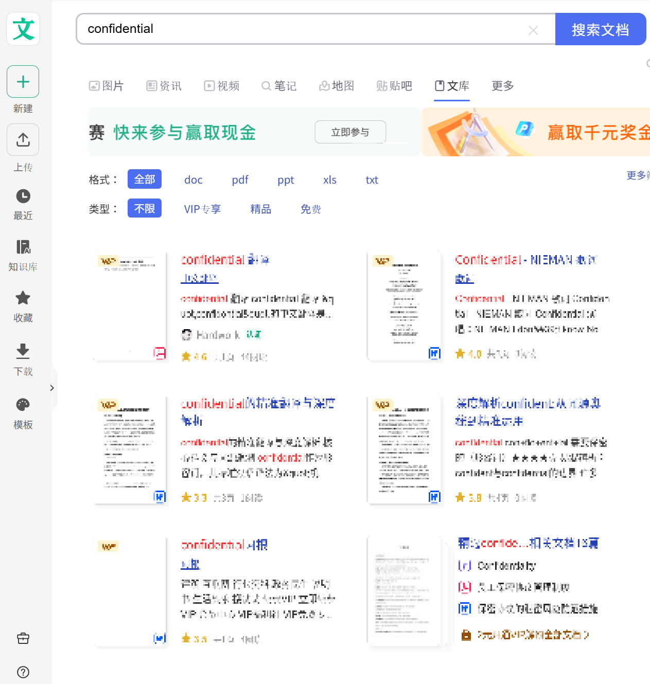 在百度文庫中,用户可以上传文件或下载他人上传的文件。由于上传的文件中可能包含特定组织的机密信息等内容,定期确认此类文件未被上传至关重要。以关键词“confidential”检索的结果如下: