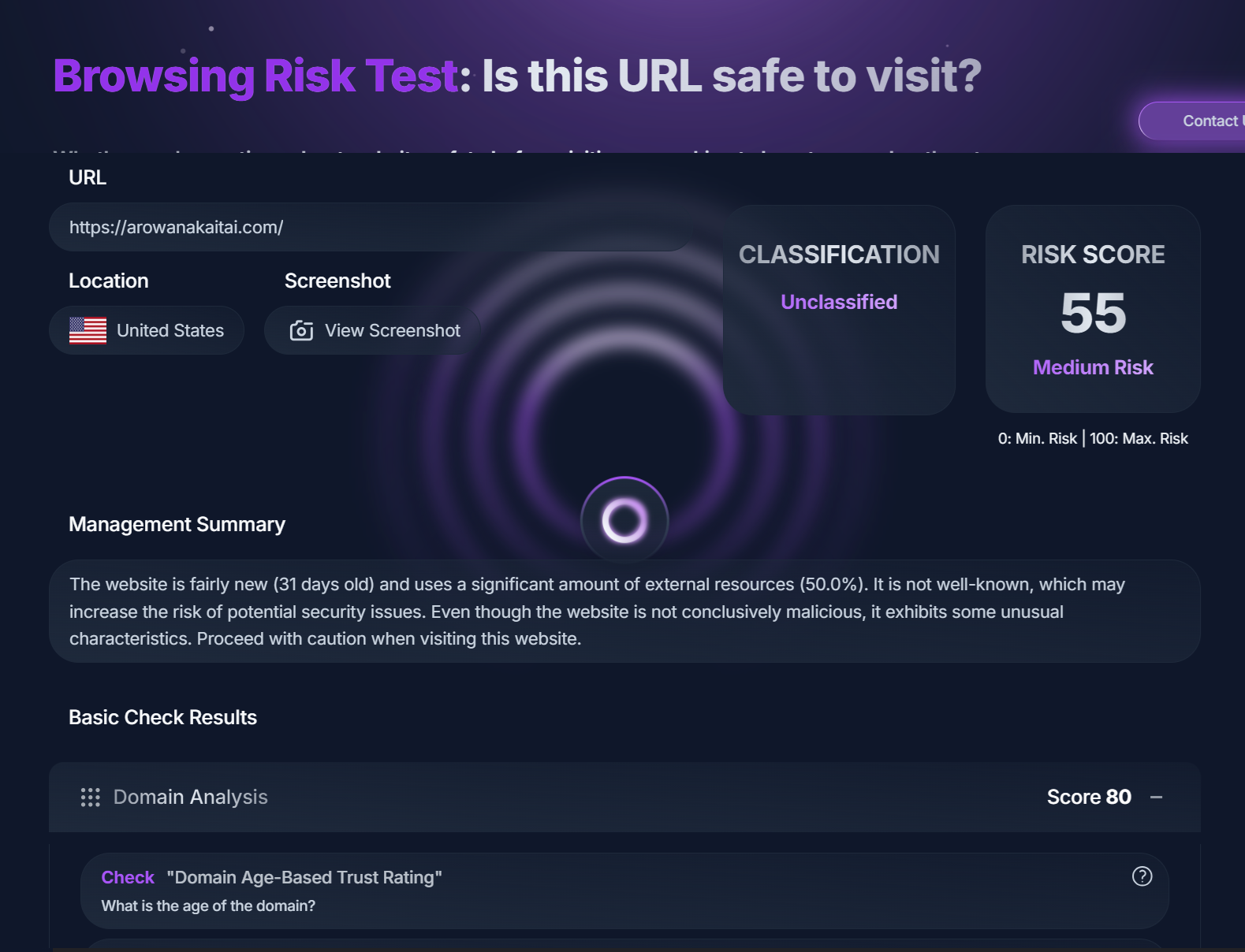 以前メモしたurlDNAやGRIDINSOFTの他に、Webサイトのレピュテーションを確認できるサイトにURLScore.aiがある。