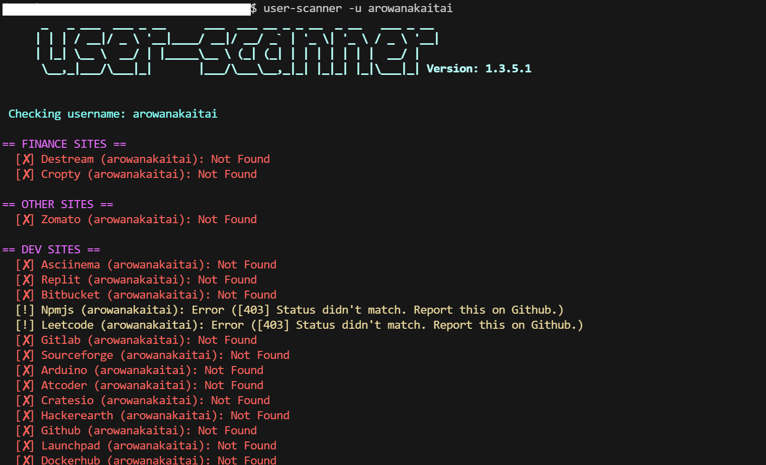 $ user-scanner -u arowanakaitai