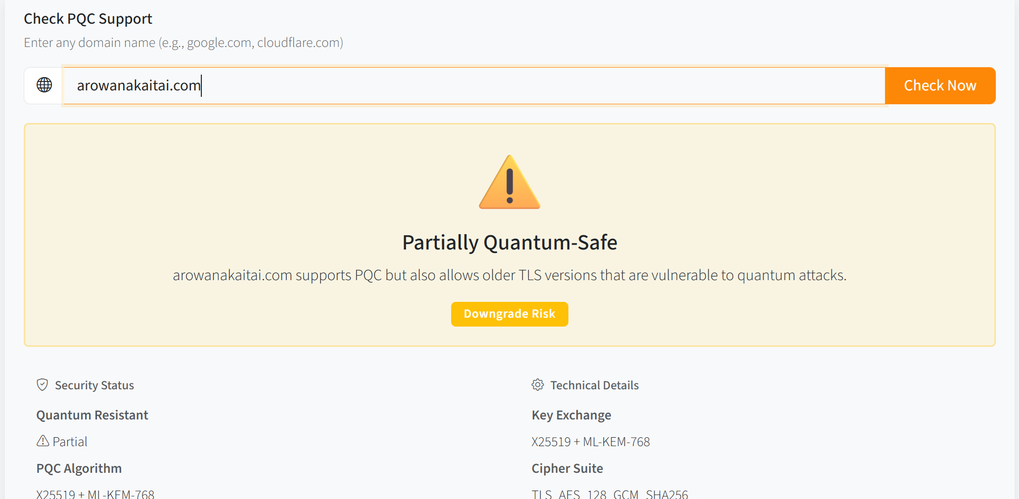 HNDLの対策には、耐量子暗号を使用した通信を暗号化が挙げられる。例えば次のQuReadyというサービスでは、対象ドメインのTLS通信が耐量子暗号に対応しているかどうかを確認してくれる。