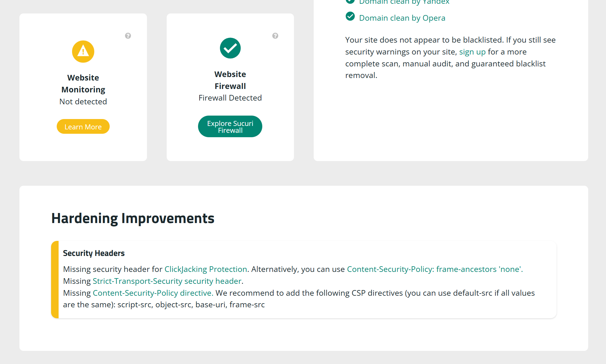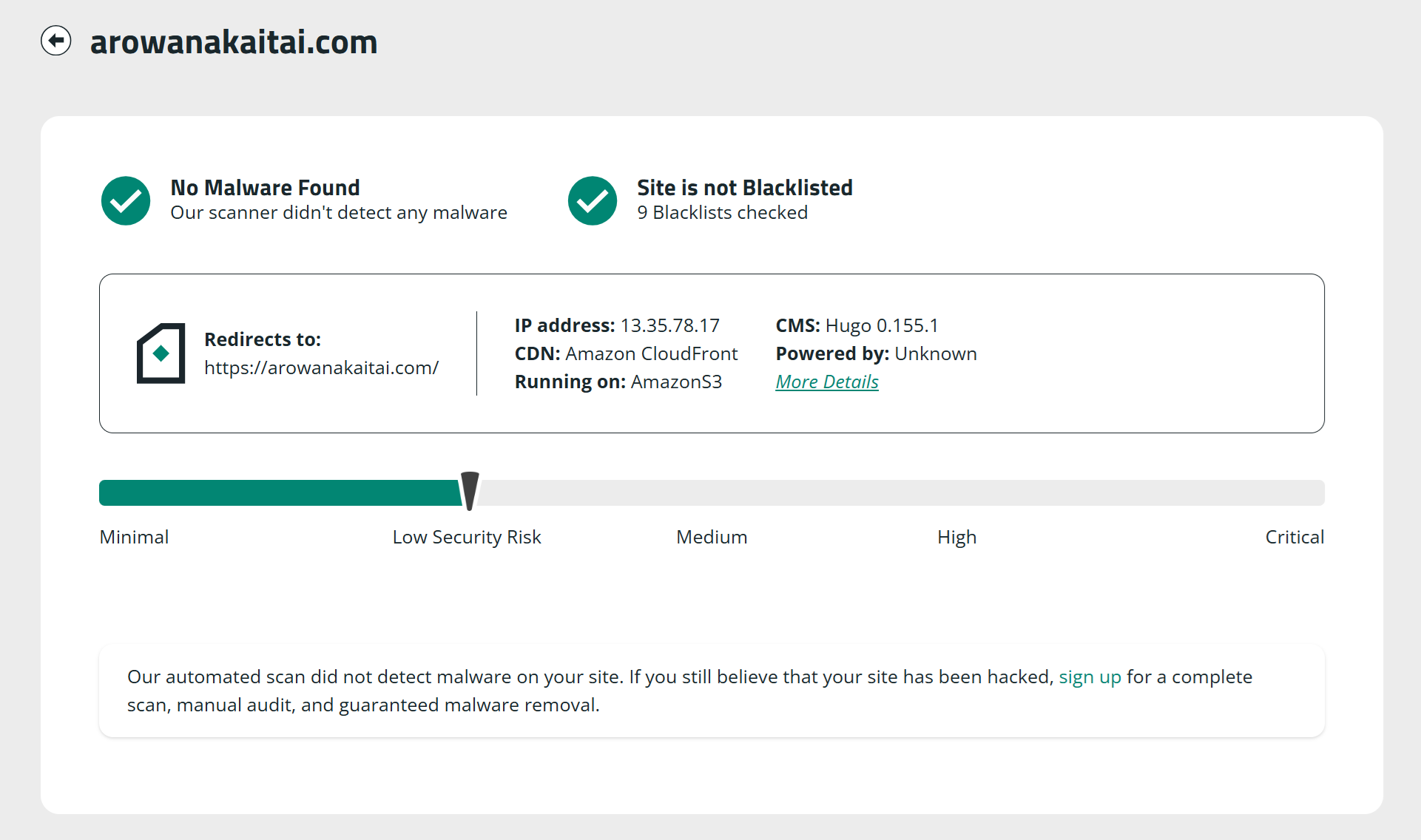 マルウェアスキャンのほか、ブロックリストのチェックなども行ってくれているようである。結果は非常に閲覧しやすい形式で出力される。「https://arowanakaitai.com/」の場合、セキュリティ関連ヘッダが不足しているとのことである。