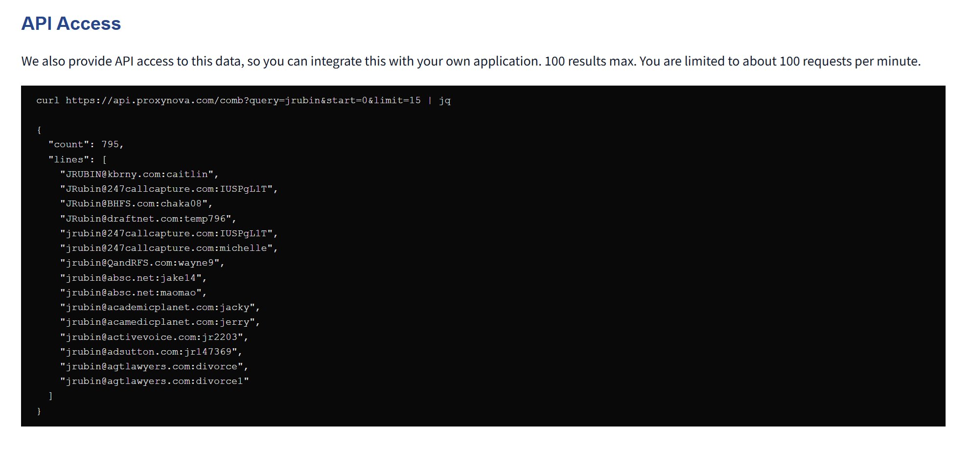 COMB(Combination Of Many Breaches)は、2021年2月に公開された、漏洩した認証情報(メールアドレスやパスワード)の最大規模のデータセットのことである。次のWebサービスでは、対象のドメインを入力すると、COMBにそれらのドメインに紐づくメールアカウントがあるかどうか確認することができる。
