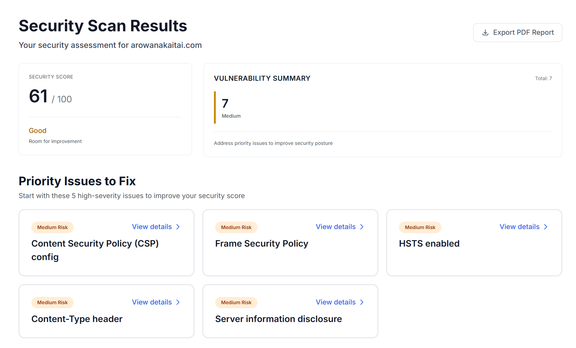 「arowanakaitai.com」を対象とする診断結果は次のとおりである。診断結果はPDFファイルでエクスポートすることもできる(Webとレポートのレイアウトが結構好みである)。