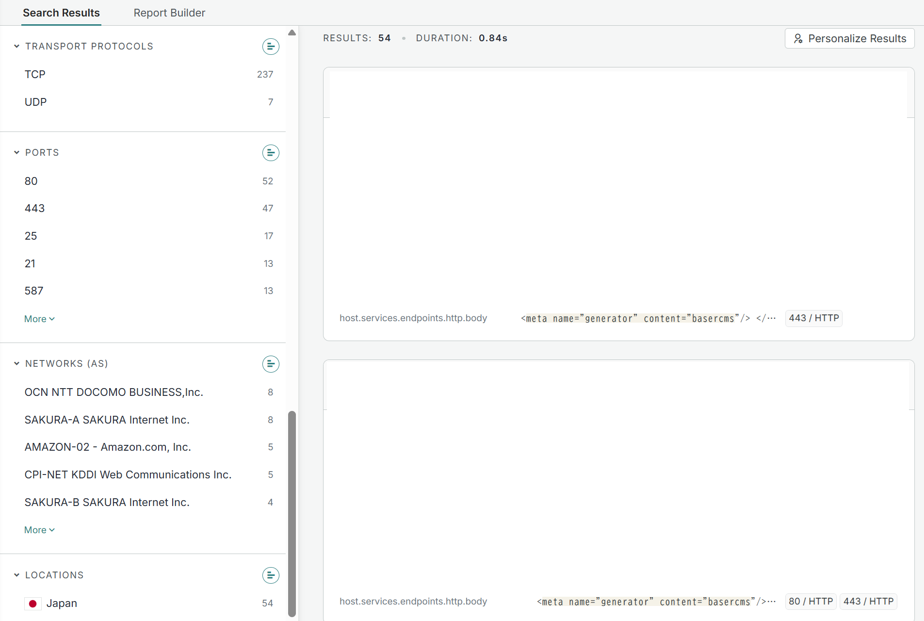 このメタタグの情報を用いてCensys Platformで検索してみると、54件の検索結果が得られた。なお、CenQLでは国内のホストである条件は指定していない。